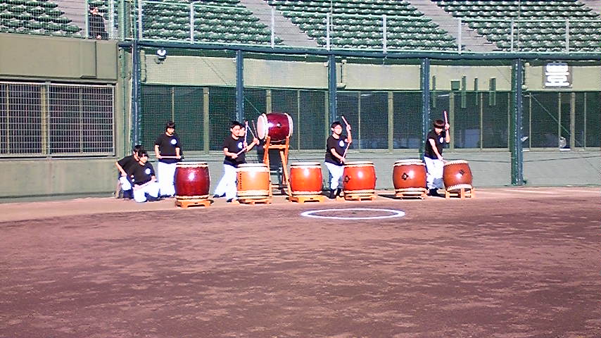 | 緑柳野高校太鼓部による「長篠陣太鼓」 | 試合に先立って行われた始球式 |
