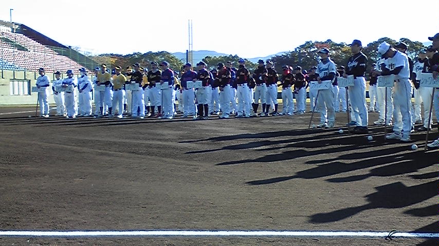 | 開会宣言する守屋氏(豊橋野球協会) | グランドに整列する12チ−ムの選手 |